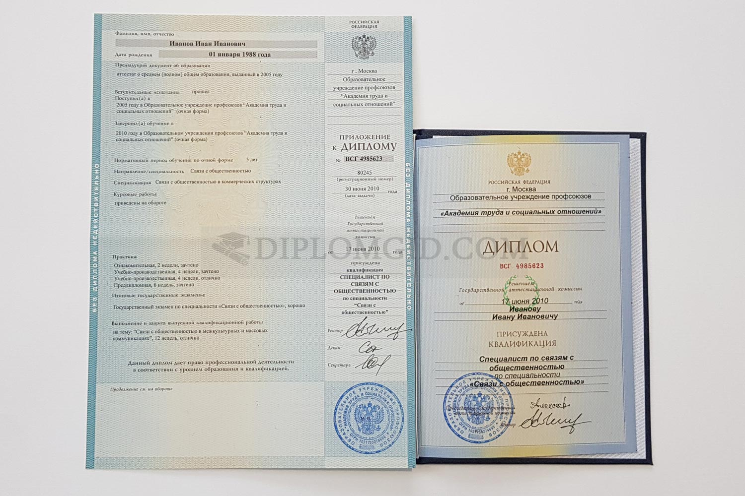 На нашем сайте Вы можете купить диплом нового образца без обучения, выданный любым ВУЗом Москвы и других городов России. В комплект входит бланк, обложка и приложение, оформленные по всем стандартам.